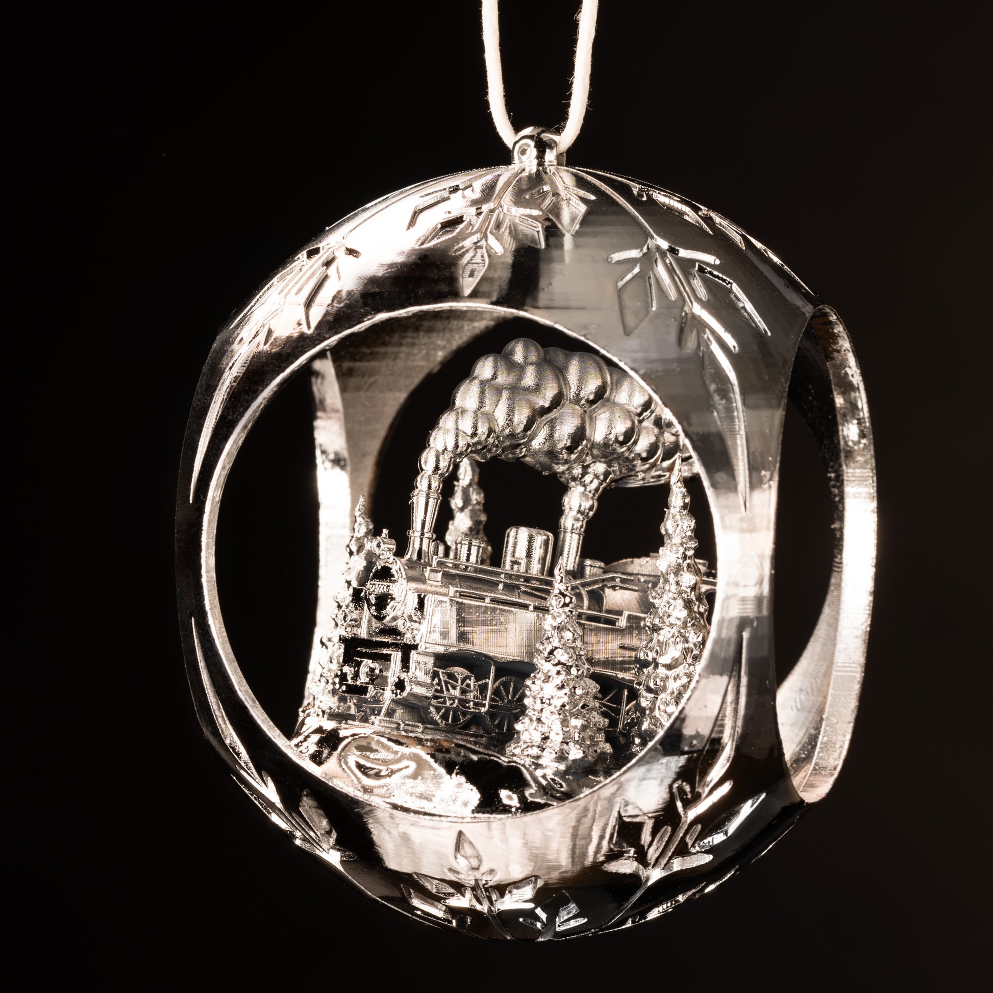 Jede Kugel ist ein kleines Kunstwerk mit einem Durchmesser von 6,5 cm. Im Inneren fährt eine Dampfeisenbahn durch den Schnee. Umgeben von einem verschneiten Tannenwald.